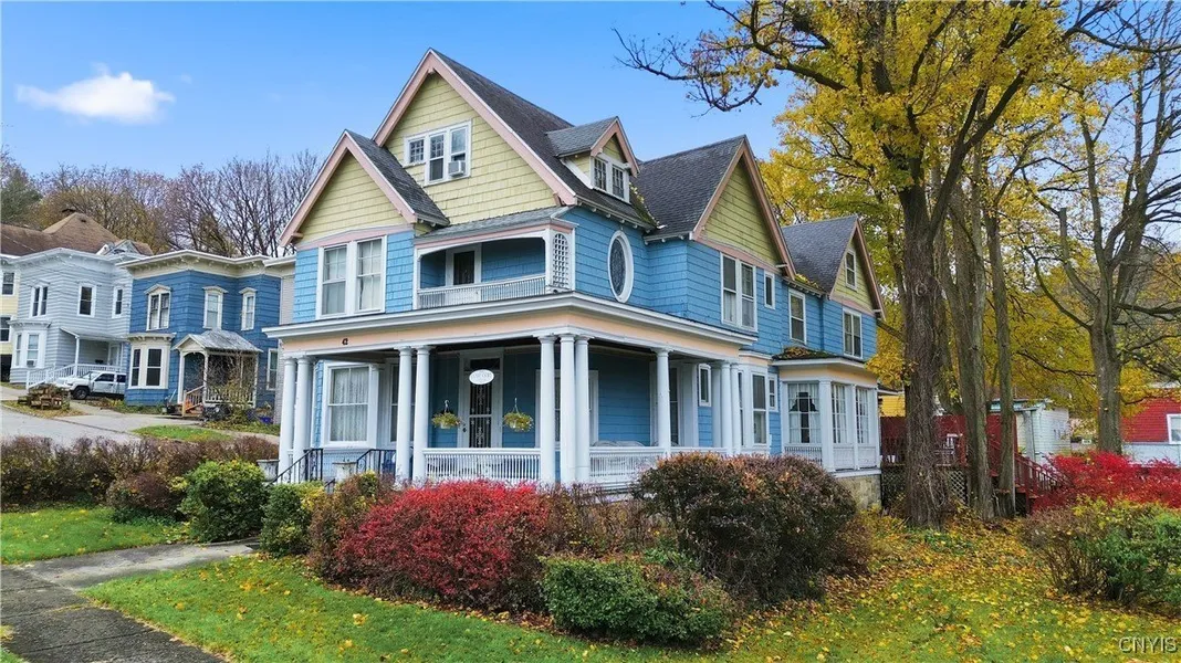 Welcome to 42 West Gansevoort Street, an elegant Queen Anne Victorian perched along one of Little Falls' most architecturally notable streets. Built in 1890 and set on a picturesque double corner lot just above the historic Erie Canal, this stately residence offers more than 5,000 square feet of meticulously preserved craftsmanship, providing a rare combination of history, charm, scale, and endless potential. Featuring six spacious bedrooms and three full bathrooms, the home showcases classic shingle-style architecture, a sweeping wrap-around porch with neoclassical columns, and beautifully restored exterior details that speak to its timeless character. Inside, the grand foyer opens to multiple formal and informal sitting rooms, each filled with natural light and rich period detailing. Pocket doors, intricate millwork, ornate fireplaces, and original hardwood flooring create an atmosphere of elegance throughout. The formal dining room is gracious in scale and flows seamlessly into the sun-filled solarium, where antique glass doors and abundant natural light create a warm and inviting gathering space. One of the most distinctive features of the home is the fully preserved butler's pantry separating the dining room and kitchen. With original glass-front cabinetry, soaring ceilings, hardwood floors, and a beautiful copper sink, it remains an extraordinary example of Victorian craftsmanship. The kitchen blends historic charm with functional updates, offering a brand-new electric stove, an arched window above the sink, a cozy breakfast area, and a brick fireplace with a copper hood. A large rear deck extends the home's living space outdoors. The expansive third floor offers a rare, light-filled artist's loft with exposed beams, wide-plank floors, and its own full and half bath-an ideal setting for creative work, a home office, or a future living suite. Beyond the main home, a detached two-car garage with an attached carriage house provides additional living quarters, including a full bedroom, bathroom, and upper loft space perfect for guests, studio use, or a private retreat.