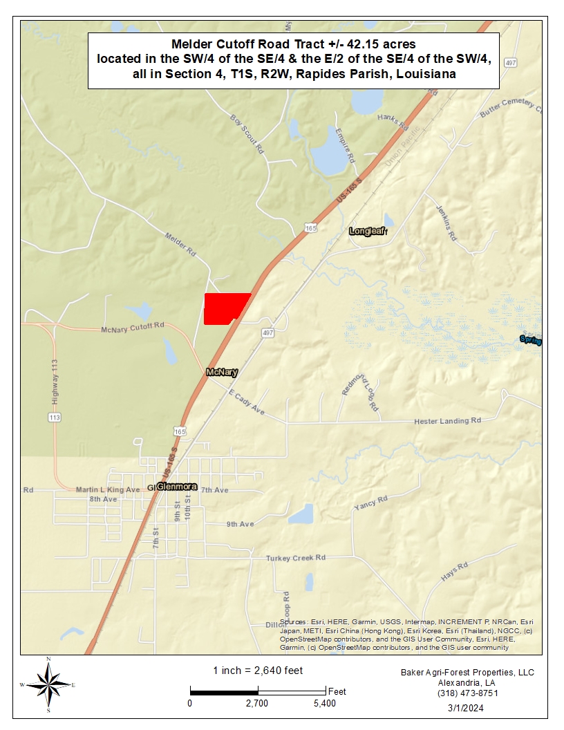 This impressive 42.15 acres tract within the village limits of McNary, LA presents a rare opportunity for investors, developers and timberland buyers alike. Ideally situated on the west side of HWY 165 and south of Melder Cutoff Road, the property boasts approximately 700 feet of frontage on Melder Cuoff Road and 1,000 feet on HWY 165 South, ensuring excellent accessiblity and visibility This would make a good commercial site. The land is predominatly covered with old growth pine sawtimber, complemented by a lesser amount of hardwood sawtimber and pine/hardwood pulpwood - providing immediate and long -term value. A timber inventory was conducted in Septmber 2023 by Baker Land & Timber Management, Inc., a forestry consulting firm confirming the property's rich natural assets. Estimated timber volumes by product class can be found in the property information sheet.