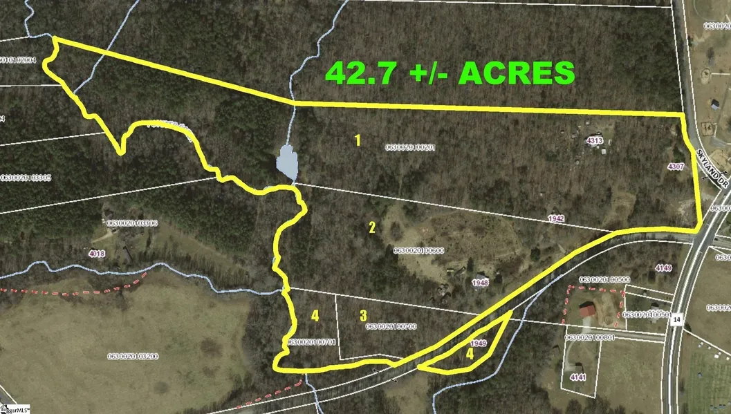 CALLING ALL BUILDERS, INVESTORS!!!!!!! Prime 42.70-acre development opportunity in the heart of Greer, SC! Property includes two houses needing renovation and one livable mobile home needing work, some open areas with trails, wooded areas with beautiful trees, and a stream along the back property line. Located just 1 mile from Blue Ridge High School and minutes from both Greenville and Spartanburg Counties. Ideal for Duplexes, Residential Subdivision, or Mobile Home Park—a strong income-producing opportunity for builders and investors. Close to Lake Robinson, Lake Cunningham, Downtown Greer, GSP Airport, shopping, dining, and major employers. Four tracts sold as one. TMS - 0630020100701, 0630020100700, 0630020100600, & 0630020100201. Rare chance to own large acreage in this fast-growing area!