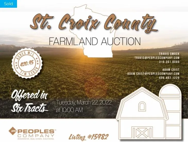 Peoples Company is pleased to present 420.95 surveyed acres of diverse St. Croix County farmland! The farm will be sold as six separate tracts through the Multi-Parcel Auction Method and offers something for everyone including tillable, pasture, and recreational land as well as a beautiful acreage site. The auction will take place on Tuesday, March 22nd at 10:00 AM At the Phoenix Grill & Event Center in Baldwin, Wisconsin.