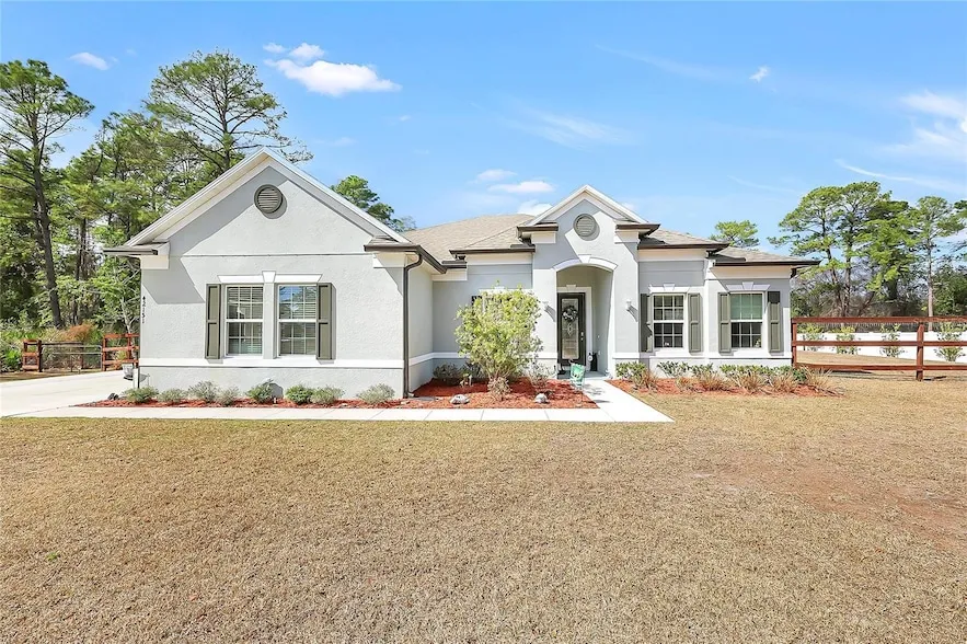 Nestled on an oversized, fully fenced lot backing to a conservation area, this well-maintained 4-bedroom, 3-bath home offers privacy, space, and a thoughtfully designed split floor plan. Unlike many homes on the market, the property is tucked away from the main road, creating a quieter and more private setting, and is not located in a flood zone for added peace of mind. The open floor plan is enhanced by elegant tray ceilings accented with crown molding, creating a bright and inviting atmosphere throughout the main living areas. The open-concept kitchen is equipped with granite countertops, a spacious island with seating, stainless steel appliances, upgraded cabinetry with crown molding, a modern tile backsplash, and both pendant and recessed lighting perfect for entertaining. Upon entry, two bedrooms are located on the right side of the home, while a guest en-suite with its own private bath sits on the left, ideal for visitors or multigenerational living. The primary suite is tucked away at the back of the home, offering a peaceful retreat with views of the conservation area. Enjoy indoor-outdoor living with a screened-in lanai and an inviting outdoor entertaining area featuring a custom stone fire pit on a concrete patio, perfect for cozy evenings and gatherings, all set against peaceful conservation views. The spacious backyard is fully fenced, includes electric already run for a future pool, and features a 15x8 outdoor storage shed for added convenience. A termite bond is in place and paid through the next year. An oversized attached garage, tucked to the side of the home, provides ample space for 3 vehicles, storage, or a workshop. HOA dues are just $92 per year and include access to the community clubhouse, park with playground, and a full calendar of community events held throughout the year. Plus enjoy deed access to Lake Norris! Conveniently located just a short drive to Publix, Wekiva Parkway / SR-429, and the shops, dining, and charm of Mount Dora, this home offers the perfect blend of privacy, comfort, and lifestyle.