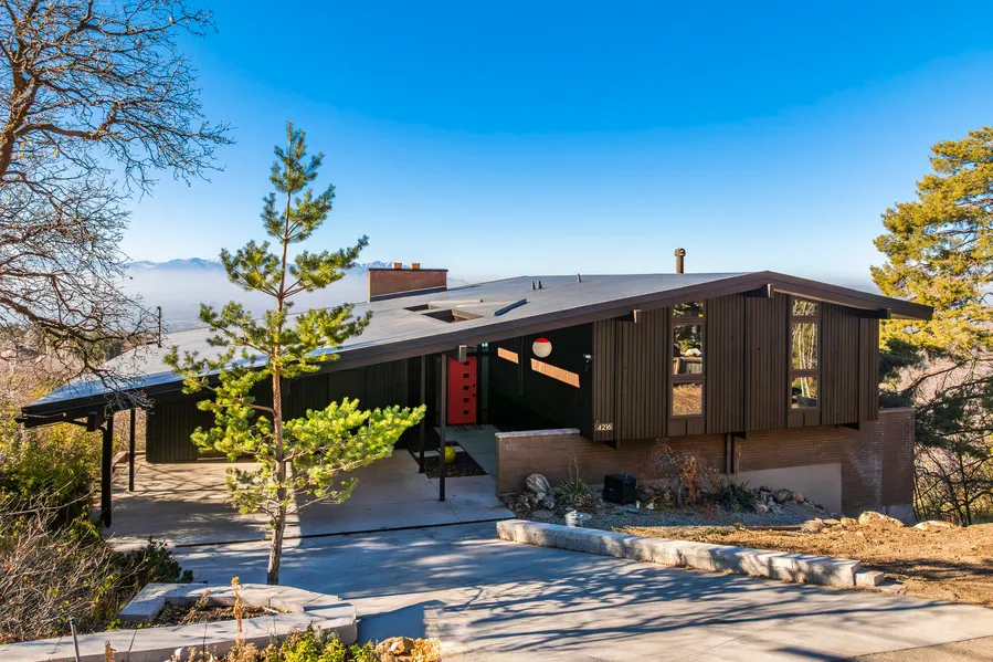 The main volume settles confidently behind a privacy wall in front, cool and composed, while the south wing lifts and reaches, cantilevering lightly over the hillside with a butterfly’s grace. A stand of scrub oak gathers around the house from the sides and rear, creating a sense of seclusion and belonging. A central walkway leads to the cheerfully orange front door, flanked on one side by a carport that is both fetching and befitting. The home’s thoughtful siting captures open valley views to the back and preserves privacy from the front. Just steps away, Neff’s Canyon Trail offers a direct connection to the woods above and beyond.
