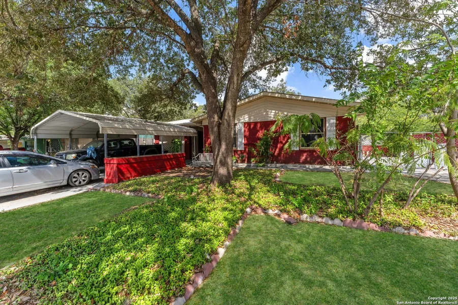 Charming & situated in a highly convenient location, this one-story style home offers an open floorplan with high ceilings & a split bedroom layout. Enjoy the upside potential of a separate dwelling unit through the converted garage space. Notice plenty of parking space with pavement on both sides, ensuring easy RV/Boat storage. Interior features include the living/dining room with separate kitchen and eating bar. The family room boasts a skylight which opens into the master bedroom, which has its own private bath and separate vanity accompanied by a spacious closet. The backyard offers a covered porch, gazebo, and flexibility, all fenced and gated. Moments from Fort Sam, I-35, 410 & surrounded by amenities, this property presents an excellent opportunity for home-buyers and investors alike. Property IS currently tenant occupied, please do not disturb tenants. Interior showings available upon contract acceptance.