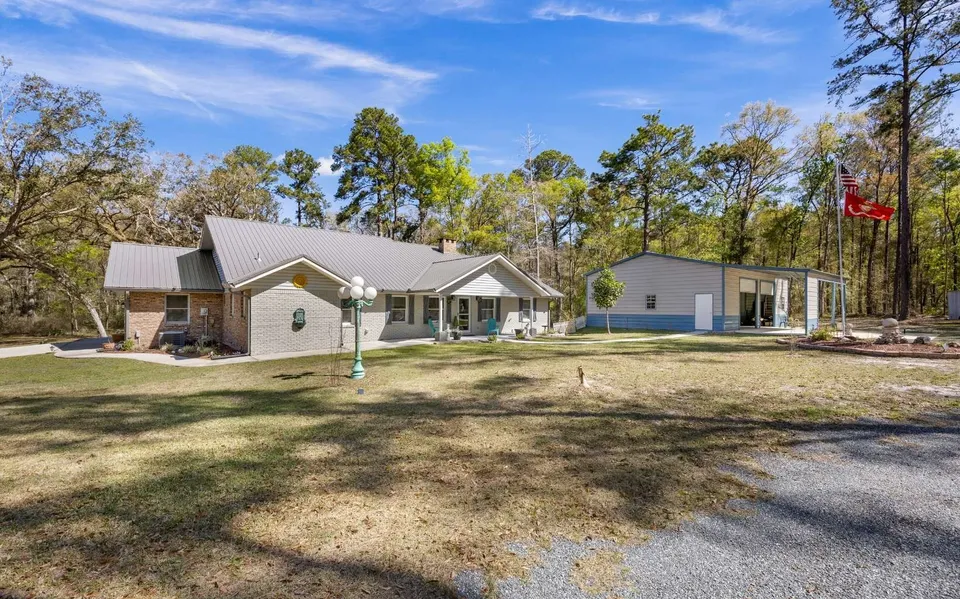 Tucked away in a serene setting yet just minutes from town, this stunning 3-bedroom, 2-bath brick home has been completely remodeled and is move-in ready! The home sits on a fully fenced 7.68-acre property, offering both privacy and convenience. Step inside to discover a beautifully updated interior featuring a brand-new kitchen with high-end wood cabinetry, stylish countertops, and a trendy tiled backsplash. The spacious great room boasts a cozy gas fireplace, perfect for relaxing evenings. The split floor plan ensures privacy, with the owner's suite featuring a large walk-in closet, dual remodeled vanities, and a brand-new tiled walk-in shower. The two additional bedrooms have fresh carpet and share a remodeled bath with an updated vanity. Enjoy peaceful views of the property from the large screened back porch—an ideal space for entertaining or unwinding in nature. The two-car garage offers convenience with two separate garage doors. A metal workshop/building, added in 2022, includes three roll-up doors, extended concrete in front, and a lean-to for additional covered space. The home's metal roof, also installed in 2021. This immaculate property is a rare find—offering space, privacy, and modern updates in an unbeatable location!