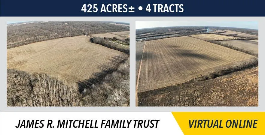 The Mitchell Farm will be sold in four (4) individual tracts. All four (4) tracts will sell on a price per acre basis, based upon a survey that is currently in progress. Surveyed acres will be used to constitute the final settlement price on Tracts 1, 2 & 3. Taxable acres will be used to constitute the final settlement price on Tract 4. All four (4) tracts will be offered through the marketing method of Buyers Choice whereas the high bidder may elect any or all tracts for their high bid. Buyers Choice will continue until all four (4) tracts have been elected. The tracts will NOT be offered in their entirety at the conclusion of the auction.