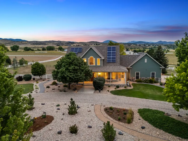 Welcome to your dream retreat on 3.53 pristine acres in the coveted Falcon Pointe community-where luxury living meets equestrian elegance. This beautifully updated 4-bed, 4-bath home showcases custom finishes throughout, including rich hardwood floors on both the main and upper levels, vaulted ceilings, and a spacious primary suite with spa-like comfort. A dedicated study on the main floor offers the perfect work-from-home setup, while the upper level features two generously sized bedrooms and a full bath. The garden-level basement is flooded with natural light and designed for entertaining, complete with a wet bar, expansive rec room, guest bedroom, and abundant storage. Step outside to enjoy lush landscaping, a private front porch, and a large back deck with a powered awning-ideal for soaking in panoramic views of the mountains and foothills. A fully paid-for solar system delivers energy efficiency and long-term savings, making this home as smart as it is stunning. Equestrian enthusiasts will love the newer barn with two horse stalls, tack room, hay storage, and a fully fenced pasture. And with the HOA's private riding arena just steps away, this property lives like 20 acres of open space and opportunity. Location perks? You're just 5 minutes from TPC Colorado at Heron Lakes, 10 minutes to downtown Loveland, and only 35 minutes from Boulder. Plus, you're just minutes from several lakes and scenic trails, offering endless opportunities for hiking, biking, fishing, and paddleboarding. A rare blend of comfort, functionality, and Colorado beauty-this is more than a home, it's a lifestyle.