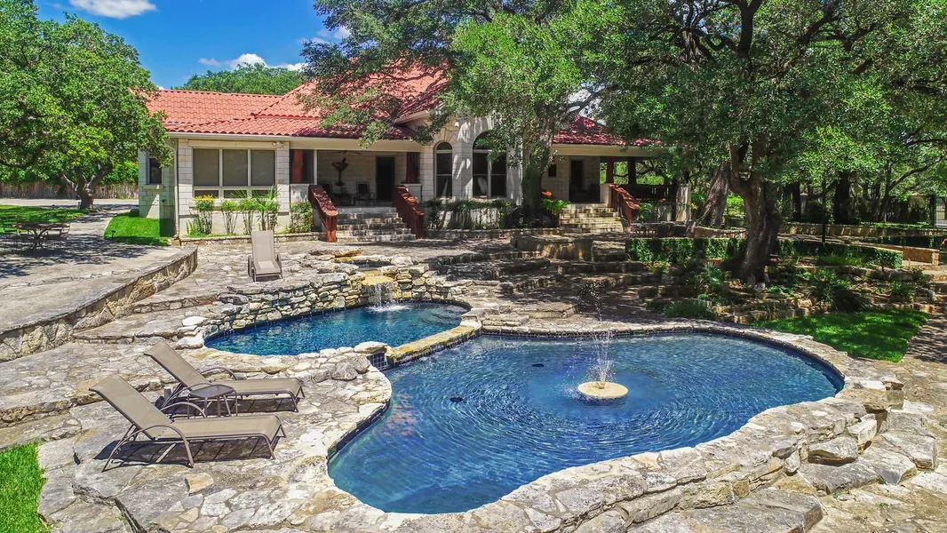 Masterfully planned, sprawling 7 acre estate within minutes of downtown Wimberley. Nearly 5 acres of the property is tucked away behind cedar stay fencing and tall bamboo shoots providing for an ultra-private oasis boasting jaw-dropping amenities. A custom-built creek flowing through the backyard was designed with a series of falls generating a sound similar to that of gentle rapids and is surrounded by lush landscaping and majestic Oak trees. These features, along with the gorgeous stone pathways winding around the property and pool area, create a spectacularly soothing atmosphere.