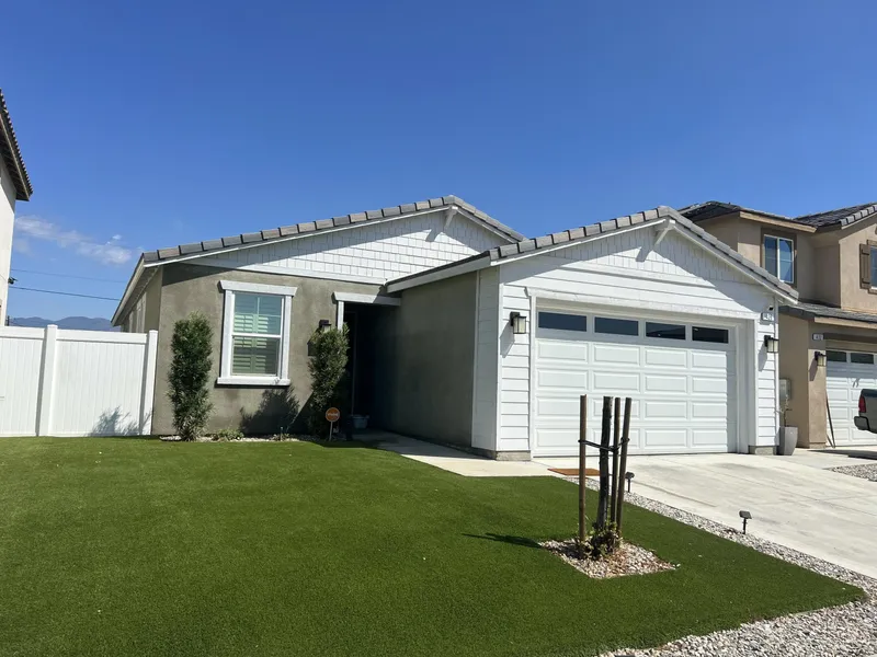 Welcome to this beautiful single-story home built in 2022, located in the heart of Rialto. Featuring 3 spacious bedrooms plus a versatile den/office that can serve as a 4th bedroom, and 2 full bathrooms, this modern residence offers comfort, style, and efficiency. open floor plan with 9-foot ceilings, abundant natural light, and elegant finishes throughout. The chef's kitchen opens seamlessly to the family room and boasts quartz countertops, upgraded backsplash, and stainless steel GE appliances including microwave, stove/oven, and dishwasher. The living spaces are enhanced by hard flooring, custom window shutters, and a functional dining area perfect for gatherings.