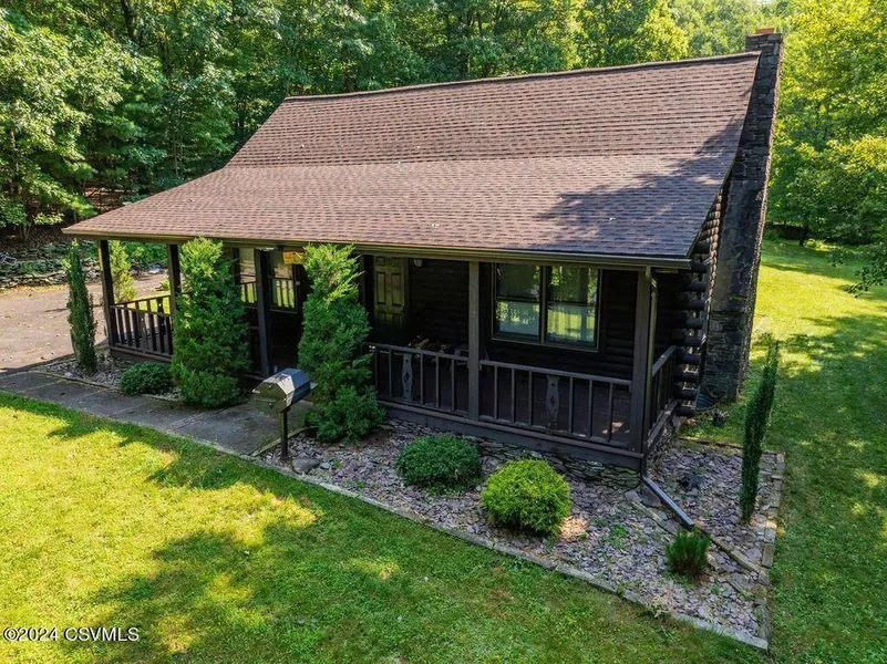 Nestled within a sprawling 43-acre landscape, this log home blends rustic charm with modern comforts, creating a serene retreat. The home's exterior showcases classic log construction with exposed beams and natural wood finishes, perfectly harmonizing with the surrounding wilderness.