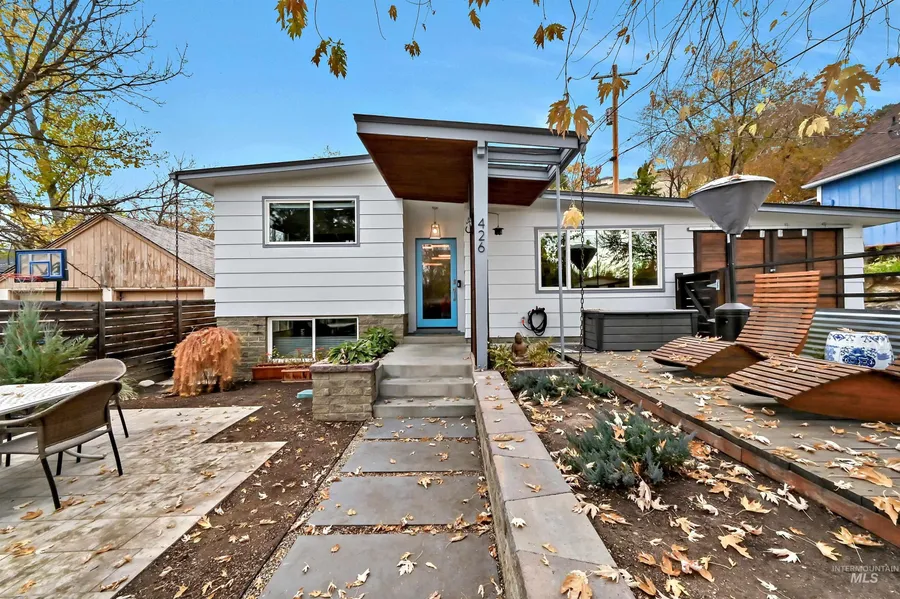 You are going to love this Mid-century modern stunner. Situated on a quiet street in Boise's beloved North End, this home is immaculate, filled with light and completely turnkey. The main level includes a gorgeous kitchen with beautiful windows, gas range, stainless appliances, breakfast bar & coffee bar. Entertain in the expansive, open-concept living room with gas fireplace, and then step into the spacious dining room for meals. Just 4 steps up to two generous bedrooms and full bath. Downstairs you'll find the private primary suite with an amazing walk-in closet that includes jewelry drawers and plenty of hanging and folding space plus a lovely ensuite bathroom with walk-in shower. Plenty of storage throughout inside as well as a front storage area outside for bikes & other equipment. No need for a lawn mower, this gorgeous home has huge, dual patios with mature landscaping out front for relaxing, plus a private covered patio off the kitchen for al fresco dining. Your car can stay in the driveway while you bike or walk to just about everything--multiple nearby trails, Hyde Park restaurants & shopping, parks, downtown Boise, and all that makes this part of the North End perfect.