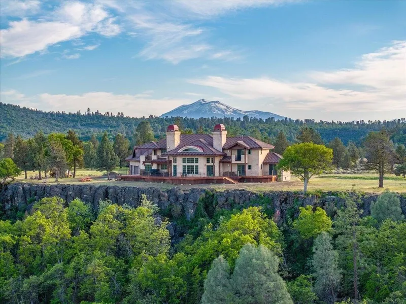 Passing through a custom lava rock gated entry to the impressive improvements. Here is an example of exquisite design and excellent craftmanship achieving the perfect blend, creating a masterpiece. This 5,230-sf, 4 bedroom, 4.5 bath luxury home is a one-of-a-kind Spanish Mission discovery and a delight to see. Encompassing 67 acres of untouched land, the home sits on a majestic lava rock bluff, capturing the sunrise and panoramic views of beautiful Fall River Valley and manicured greens of a nearby golf course. Entering the home and stepping into the great room will take your breath away, not only is the space itself spectacular, but the wall of windows capturing the views puts it on a new level. A custom lava rock fireplace encompasses one wall. The imported handmade Mexican tile floors flow throughout the home. Two glass doors open to the expansive back deck with 2nd custom lava rock fireplace and BBQ area. What a wonderful space to relax and enjoy the view. The great room opens to a dream kitchen, charming breakfast nook and butler pantry. Also, on the main floor you will find two additional bedrooms with ensuite baths. An office/den and large laundry. Ascending to the second level on an open stairway brings you to a balcony overlooking great room. This level features a well-appointed guest suite along with the owner's suite. The detached 3 car finished garage has a wonderful guest apartment above. Unique lava rock pump house and storage room is the final building on the property, which is mainly level, other than the fantastic rock bluff. This is an amazing opportunity to own this spectacular home and be the first to warm it with family and friends.