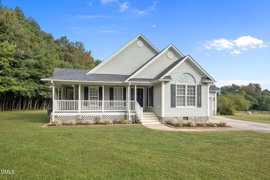 Dayfield Subdivision home set on over an acre with wraparound porch, set back from the road for a peaceful, private feel. Enjoy multiple outdoor living spaces including a wraparound rocking-chair porch, covered back porch, and an entertaining deck. A large storage shed provides great space for tools, equipment, or hobbies. Inside, the family room features soaring ceilings and a cozy fireplace ideal for relaxing or gathering. The spacious kitchen offers a center island with seating and flows into the dining room with a bay window and direct access to the porches, making indoor-outdoor living easy. The primary suite includes an en-suite bath with a soaking tub. Two additional bedrooms offer comfort and flexibility for guests, kids, or a home office. A convenient laundry room is located just off the garage. Upstairs, a versatile bonus room adds valuable extra living space and connects to a walk-in, floored attic perfect for storage or future expansion. A charming home with privacy, space, and outdoor living in a great neighborhood.