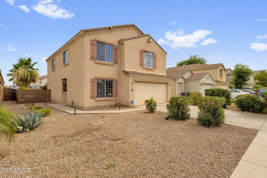 Welcome to this beautiful 4 bed, 3 bath home located in the desirable Senita community of Maricopa. With over 2,200 sq ft of living space, this two-story home includes a spacious upstairs loft, ideal for a second living area, playroom, or office. The large great room flows effortlessly for entertaining. The primary suite offers a walk-in closet, dual sinks, and step-in shower. All bedrooms are generously sized. Step outside to your private backyard retreat with a Pebble Tec pool, built-in BBQ, and low-maintenance landscaping that is perfect for outdoor entertaining. Covered patio and extended paver area provide ample outdoor living space. Additional highlights include a newer A/C unit and water heater, and all major appliances. Don't miss this turn-key gem close to schools and shopping.