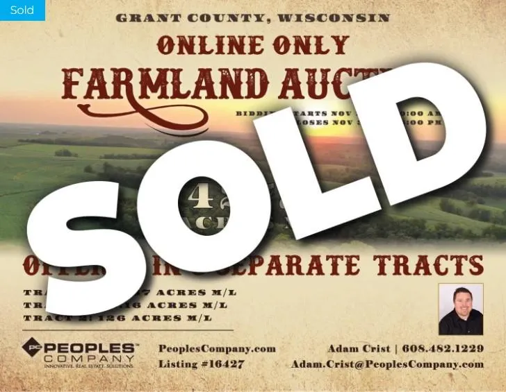 Grant County, Wisconsin ONLINE ONLY Farmland Auction - Peoples Company is honored to present 429.45 acres in Grant County, Wisconsin. The farm is in the heart of the highly sought-after Driftless area just four miles west of Livingston, Wisconsin. Every direction of the property has vast views and elevation changes. The views are so expansive you feel as if you are out west in the mountains. This farm is sure to check all the boxes with an incredible natural setting, more hills than you've ever imagined finding in the Midwest, good old fashioned rural serenity, and total relaxation. This farm has not been available to the public in nearly 80 years making it a rare opportunity to own an exceptional farm in the heart of Grant County! This highly desirable farmland consists of a total of 429.45 acres with 105.65 FSA cropland acres and over 300 acres of some of the best grazing pastures in the Tri-State area. The farm supports a NCCPI soil rating of 61.2 with Newglarus and Palsgrove silt loam as primary soil types. Whether looking for an add on to an existing farm operation, a premier hunting destination, an investment property, or that forever place to call home, consider bidding online at this auction as real estate of this stature rarely reaches the market.
