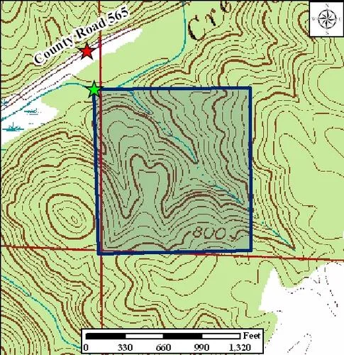 Take I-65 to exit 299 (AL 69/Jasper Exit). Travel Northeast on County Road 40 for 0.2 miles, and turn right (East) onto County Road 565. Travel East on County Road 565 for 2.9 miles and you will be near the red star on the map. To access the tract, you will have obtain permission and cross private land.
