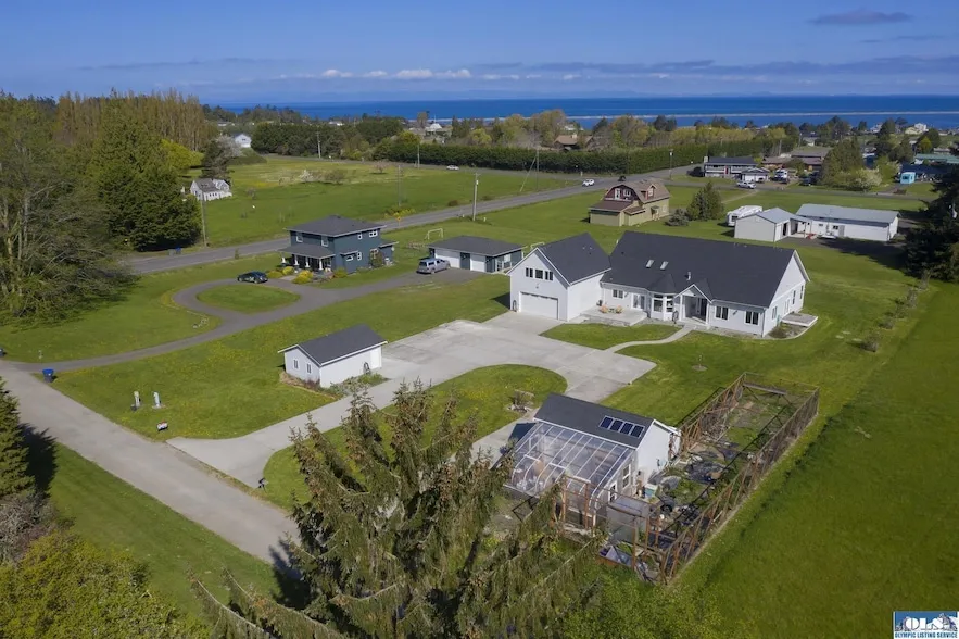 Large open modern farm house style home on acreage with multiple garage/shop buildings to accommodate all of your passions. Enter via your circular drive past extra shop buildings and greenhouse, plus fence protected garden space with plenty of elbow room. Spacious great room with a beautiful propane fireplace open to a chef's kitchen with Quartz counters, custom lighting and modern appliances. South facing front porch off the great room to soak in the sun. Large primary bedroom offers a dedicated deck, large walk-in closet, huge primary bath with quartz counters, large tub and beautiful tile shower. Another large office off the entry plus two more bedrooms each with an ensuite. Above the garage is a huge bonus room with vaulted ceilings and another full bathroom. Deck off the bonus room with a nice view towards the Strait of Juan de Fuca and Canada. 3885sf of finished living space PLUS 1651sf of garage space located on over an acre just a short walk to Dungeness Bay and the boat launch at Cline Spit. The Cedars at Dungeness Golf Course and restaurant are less than a 5 minute drive. An ideal property with tons of space in an excellent location.
