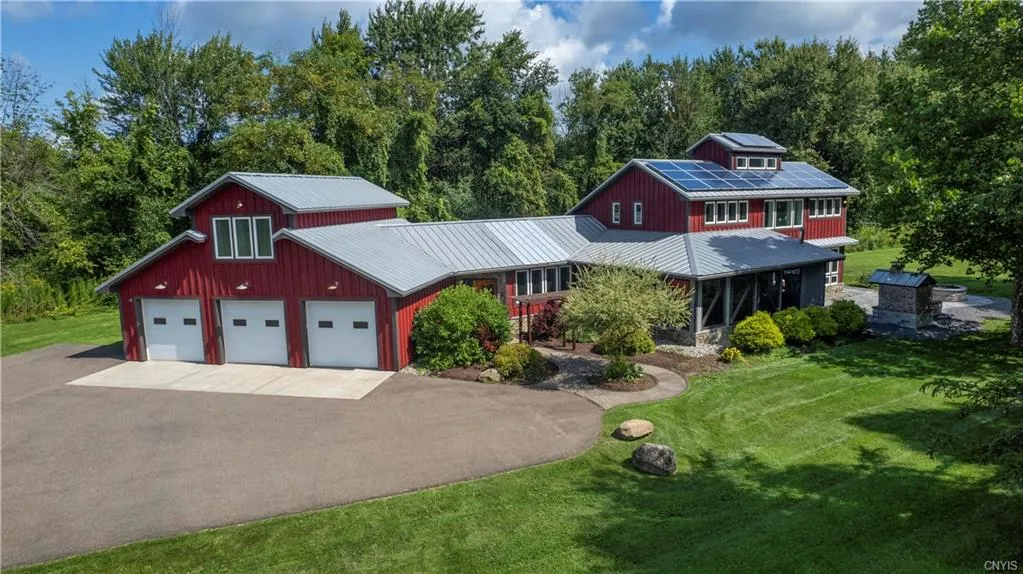 An architect’s imagination has come to life in this exquisite home; the menu of custom features will dazzle you: white pine board and baton siding; stamped walkway leading to the pergola-covered entry; stone patio with built-in fire pit, pizza oven, and grill; passive and active solar heating system; 2-acre pond; stamped/stained concrete flooring with multi-zoned radiant heat; custom built cherry drs; hand-hewn support beam; soaring ceilings with sun filled windows; circular black walnut kitchen Island; one-of-a-kind kitchen cabinetry; contemporary wood stove in family room; slate covered window plant alcoves; arts and craft light fixtures; custom fabric & insulated cellular shades. The attached 3+ car garage with foam insulation has a second story that offers unlimited potential. Membership in the 15-family White Anchor Cove association grants private access to 35 acres of recreational trails, a clubhouse, sandy beach, and your own boat slip on 2,600’ of pristine Cross Lake – you will have access to the 525-mile NYS Canal System from your back yard. The current owners have recently invested nearly $200,000 in upgrades to keep this one of the most distinctive properties in CNY!