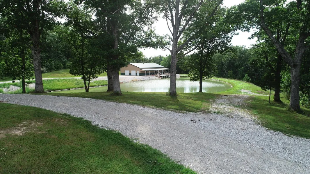 Nestled within this beautiful landscape is a 40 x 70 cabin, complete with a 2-car attached garage, 1.5 bathrooms, geothermal heating, vaulted ceilings, and a propane fireplace. Additionally, the proximity of the cabin to Mark Twain Lake allows for lake access and picturesque views in just a short walk.