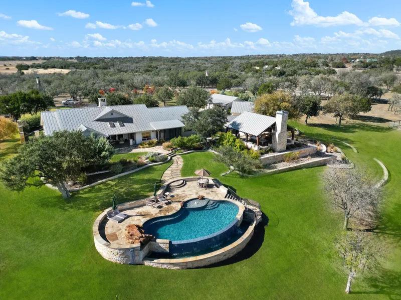 Welcome to this manicured 51-acre ranch surrounded by hill country views in a 900-acre gated pastoral community. Enter the property via private gate, drive the paved, winding tree-lined road past the flag to the main home, guest cabin, entertainment pavilion. The primary home is a 3 bed 2 bath home and 1 bed 1 bath guest cabin that features vaulted wood and beam ceilings, massive fireplace, wood stove, alder and rock walls, walk in showers, granite counter tops, outside screened dining and covered sitting areas with panoramic views. There is parking for 10, windmill, cedar encased cistern, flagstone walkways, custom iron gates, large private courtyard, extensive irrigation and 2 excellent wells, rock bordered raised flower beds, 3 septic systems, 60kw diesel generator with 750- gallon fuel capacity, livestock buildings with paddocks, large barn, fencing, shooting range, seasonal creek, pond, hot tub, swimming pool, and a covered concrete slab RV pavilion with 50-amp service. This property is a haven for year-round outdoor entertainment as well as ultimate comfortable and cozy inside living. Wildlife is abundant, hunting is allowed, with a wildlife tax exemption for each residence. For all showings call Hudson Ross 512-354-9440