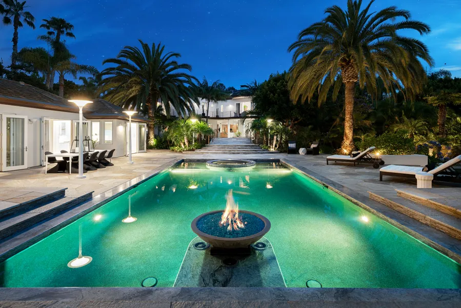Peaceful Tranquility surrounds this contemporary architectural masterpiece encompassing a magical nearly two totally private acres, which is just a short 1.5 miles to the Pacific Ocean. This private compound includes the main residence, two detached guest houses, and a resort-style saltwater pool, which features fire and a stone waterfall, designed by the renowned Skip Phillips. The lighted tennis court is complete with a viewing pavilion. For the most discriminating clients, the entire compound is meticulously appointed and exudes world class elegance with unsurpassed craftsmanship throughout! The solar powered main residence features approximately 7K sqft with 5BR/5.5BA suites plus two guest houses, totaling approximately 9K sqft. The highest quality finishes are numerous and can only be appreciated in person! Some of which include a state-of-the-art smart home automation Creston System, wiring throughout for ethernet, surround sound, separate temperature controls for each room, designer curved walls & window walls, floor to ceiling glass doors, 24 x 24 limestone, granite flooring, numerous English Sycamore lacquer cabinets, Wolf ovens, 2 Sub-Zero full size refrigerator & freezer, plus 4 Sub-Zero refrigerator drawers, Sub-Zero Wine cooler, and 2 Miele dishwashers and espresso maker. Rain glass opens to the family/theatre complete with Creston wireless system. Sleep under the tropics of Kentia palms through the picture curved glass window in the master ensuite with French doors that open to your own private balcony overlooking the amazing, lush landscape. Enter the spacious bath complete with a rain shower/steam. Never leave the compound while enjoying the walking paths through the tropical oasis that you will call home. Lavish outdoor entertainment areas, complete with wood burning fireplace, Wolf BBQ, Evos, and seating for over 12.