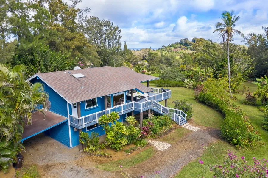 A Maui tropical retreat! Set on 2 lush acres in Haiku, this beautiful 4 bedroom, 3 bath cedar pole house has a flexible floor plan that can provide multiple living options. Upstairs is the kitchen, living room, master bedroom, and full bath. Downstairs there are 3 bedrooms, 2 bathrooms, a den with a full service wet bar and laundry room/workshop. The spacious living room features a wood burning stove, surrounded by large windows and wrap around deck. Kitchen was remodeled in 2020 to include new Maytag appliances, cabinets and granite countertops. Other kitchen features are a bay window with bench seat, vaulted ceilings and a large pantry with access to the deck. Home also has newer vinyl plank flooring throughout, skylights, a carport and gated entry. Lots of possibilities for this 2 acre property. There are numerous fruit trees including: banana, coconut, papaya, avocado, starfruit, mango, citrus and more!