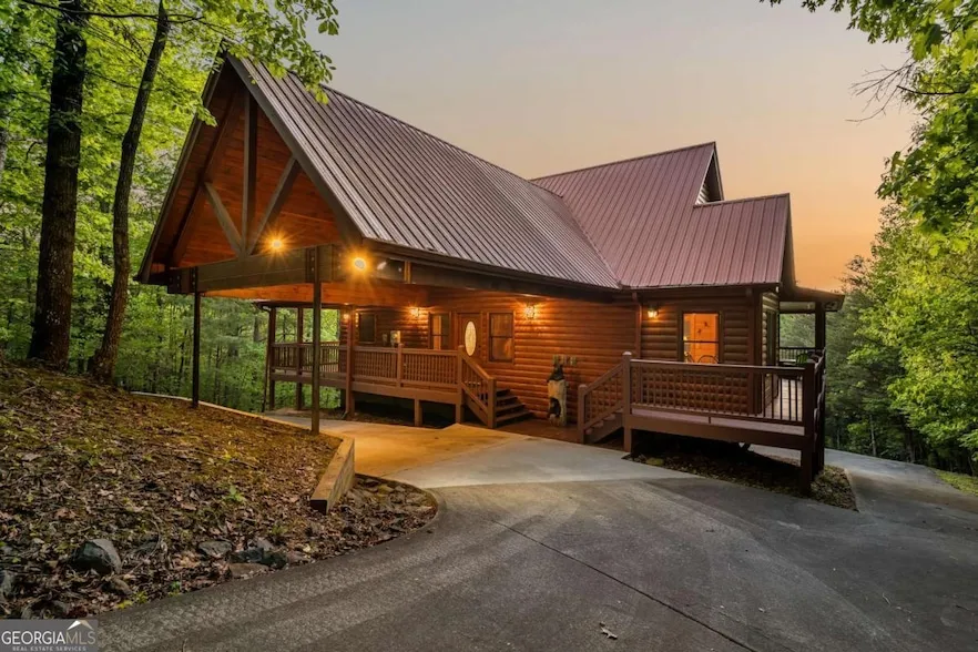 Breathtaking Mountain Views & Sunsets: Welcome to Spruce Roost, your dream escape! Nestled in the heart of the Blue Ridge area mountains, this beautifully crafted 3-bedroom, 3-bath log-style home seamlessly combines rustic charm with contemporary comfort and is priced far below market of other mountain view properties! Step inside soaring vaulted ceilings, warm pine wood finishes, and an open concept living space designed for both relaxation and entertaining. Enjoy your morning coffee or evening glass of wine from the spacious wraparound deck, where panoramic views of rolling hills and vibrant sunsets create a picture-perfect backdrop. Large windows bathe the interior in natural light while framing the stunning scenery just beyond your doorstep. The main floor features a large open concept living room and kitchen with dining. Cathedral ceilings, gas log stone fireplace and picturesque windows showcasing the long-range mountain views are some of the many highlights. Large laundry room equipped with washer and dryer & additional storage space. Main level bedroom has a private entrance to full bath with double vanity, extra wide double-hung closet + private access to the screened-in back deck. The luxurious light-filled master suite with vaulted ceilings features an en-suite bath, walk-in closet, stone tiled walk-in shower, garden tub, double vanity, gas stone fireplace and stunning mountain views from your private balcony. The completely finished terrace level offers a great room furnished with ping pong table, foosball table, massive entertainment center and reclining sectional couch. Game-On in this all-time fun space that spills out to another private deck with room for hot tub. The cozy terrace level bedroom with roomy closet space & futon for even more sleeping options. There's a separate full bathroom completing the home with a full bath on every level with each bedroom offering generous space and privacy. Yes, the tankless water heater keeps up with everyone! Circular concrete drive provides loads of parking. Short Term Rentals Allowed.