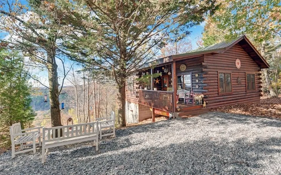 Welcome to your private mountain hideaway, tucked into the serene landscape of Yahoola Valley just 15 minutes from downtown Dahlonega. This charming log cabin, nestled on a full acre that borders the National Forest, offers an exceptional blend of seclusion and natural beauty. Inside, you’ll find a warm and inviting layout with two bedrooms and one full bath, making it perfect for a small family, weekend retreat, or peaceful full-time residence. The eat-in kitchen is a cozy spot for meals, offering a front-row seat to the mountain views just outside the window. Built in 1999, the home maintains its rustic charm while providing the durability of a metal roof. The real showstopper, however, is the outdoors. THIS VIEW!!!! Wake up to sweeping mountain views, enjoy the peaceful forest as your backyard, and at night, marvel as the twinkling lights of Dahlonega glow in the distance. Whether you are sipping coffee on the porch or heading out for a hike right from your property line, this cabin offers the ultimate North Georgia mountain retreat.