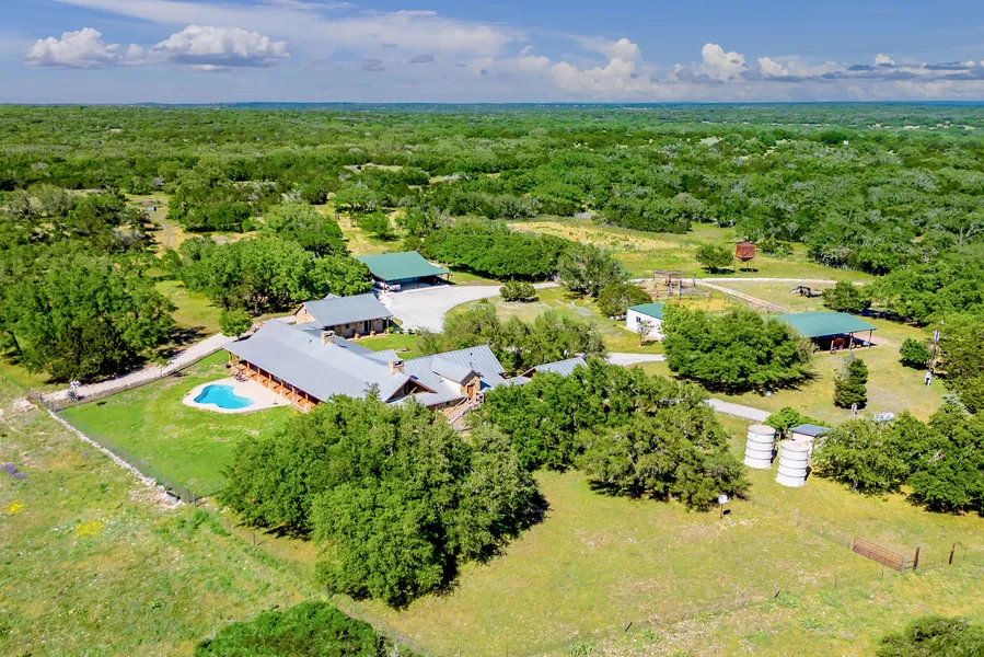 If you enjoy Hill Country outdoor living and entertaining with your family and friends, this ranch is for you! The great room, master bedroom suite, and guest bedroom cabin all have doors that connect outside to the 3,422 SqFt of covered porches and pool area, which are all perfect outdoor spaces for socializing, dining, and grilling. The swimming pool has approximately 475 SqFt of surface area.