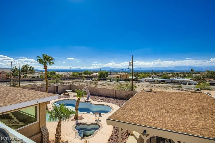 Sunrise Mountain single story gem on a half-acre lot with no HOA. Enjoy unobstructed views of the Las Vegas Strip, Downtown, and mountains from the rooftop deck. This home offers RV parking, 6-car garage with ample storage, and expansive driveway parking behind a private block wall plus additional exterior parking. Inside features 5 bedrooms, 3 full bathrooms, a spacious living room with vaulted ceilings and cozy wood-burning fireplace, separate family room, and dining room. The kitchen includes granite countertops, custom cabinets, double oven added for large family meals, walk-in pantry, all appliances and utilities electric, and garden windows for natural light. The backyard is built for entertaining with an elevated patio, huge covered patio with ceiling fans, custom pool with slide, and spa. Easy-care landscaping and tons of space to make it your own. Previously approved 1,800 sq. ft. addition drawn up with an architect. This home has so many amazing possibilities—don’t miss out!