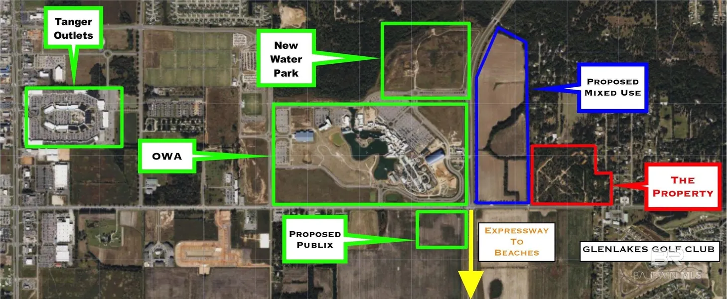 44.23 +/- acres - assemblage of 11 contiguous tax parcels - approved mixed-use City of Foley PUD - Currently approved for a 9-bay retail strip center, 108 condominiums in two buildings, 26 townhouses, and 82 SFRs. LISTING BROKER MAKES NO REPRESENTATION OF ACREAGE ACCURACY. BUYER TO VERIFY. Buyer to verify all information during due diligence.