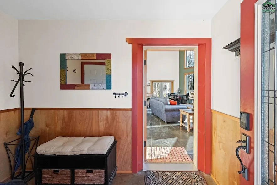 Welcome to 440 Polkadot in Fairbanks! This stunning 3-bedroom home with a bonus room and 2 bathrooms offers the perfect combination of privacy, style, and function. Nestled on the scenic east side of Fairbanks, this home features a long, private driveway and vacant lots next door and across the street, giving you extra peace and quiet. The main highlight is the breathtaking wall of windows soaring two stories, ideal for enjoying the Northern Lights during those crisp winter nights. Inside, the chef s kitchen is a culinary dream, boasting an industrial refrigerator and freezer, perfect for hosting gatherings or preparing gourmet meals. The polished radiant floor concrete flooring provides modern comfort throughout the home. The laundry is thoughtfully located in the guest bathroom, helping keep the garage clean from dirt and grime. The large 2-car garage comes with extra-high ceilings, giving you plenty of space for vehicles, tools, or storage. With its south-facing windows for natural light and plenty of privacy, this home is a true gem. Don t miss the chance to make it yours!