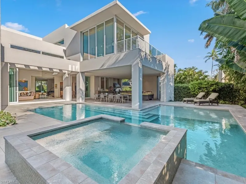 Location , location , location the perfect setting for sun enthusiast due to the rear southern exposure on a generous 0.37 acre size lot!!! Located on a quiet street in the heart of The Moorings neighborhood with convenient access to the Gulf through the private neighborhood beach park is only blocks away as is the newly opened Four Season Resort. Casual living, outstanding location and exceptional entertaining space are only a few of the spectacular features of this highly crafted custom home built in 2016. Herscoe Hajjar Architects succeeded in creating an optimal and spacious floor plan that feels wide open and bright, combined with modern clean lines and a practical flow. Subdued wall color and limestone flooring provide an excellent backdrop for standout features such as a floating staircase, artisan created lighting fixtures, and see through fireplace. Rich Sycamore cabinetry, oversized square island, coffee station speaks to an inviting kitchen space for multiple cooks in the family. The beautifully lush landscaped lot offers useable space and privacy in both front and rear yards, and the oversized lanai overlooks an architecturally designed pool. An abundance of floor to ceiling doors throughout pocket back to enhance the front to back entertainment options. A spacious primary suite offers enticing views to the pool and spa from the tranquil lounge area, closets galore, oversized shower and elegant custom vanities. Two upstairs guest rooms have access to their own lounge with coffee/beverage bar and workout area. A 3rd oversized bonus room with private balcony is currently acting as a large office, and could be a full or part time guest room, art studio, playroom, hobby room and any other use. In addition to the abundance of storage in the laundry room, the extra deep/wide/high garage with additional built-in cabinetry surpasses any storage expectations. Come and experience this extraodenary custom home yourself.