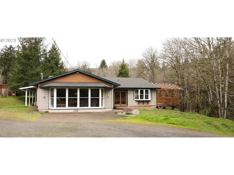 Escape to a serene oasis surrounded by nature with this stunning property! A private, gated driveway leads you to a beautifully maintained landscape that effortlessly blends with the surrounding wild forest. Follow the trail to a year-round creek with a tiny "creek island" all to yourself! The home has new siding and is wired for a backup generator and features a cozy wood stove, new dishwasher, elegant French doors and a spacious deck that overlooks the year-round creek. The owners suite is a true retreat, that includes a huge bedroom with seating area an entire wall of bay windows, a walk-in closet and a luxurious completely remodeled en-suite bathroom. The second bedroom has it's own bathroom. Additionally there's a 10x16 detached office and a 2 car detached garage for your convenience. Apple, cherry and plum trees with raspberries, grapes and many other herbs. This magical property will not last!