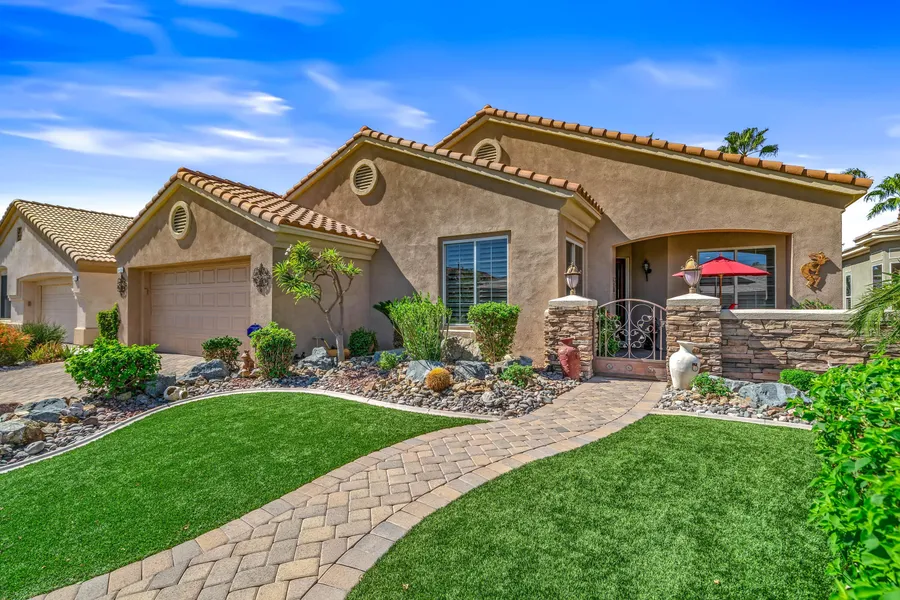 SPECTACULAR VIEWS from this 2407 sq. ft. 2 bed, 2 bath PLUS DEN home in Heritage Palms C. C. Featuring beautiful brick paver driveway AND extended paver front and rear patios, artificial turf, desert style landscaping, entry courtyard and leaded glass front door. This spacious OPEN DESIGN has plenty of room for your large dining parties, casual bar with sitting area to entertain guests and family room off of the beautiful island design kitchen with new stainless appliances. Additional upgrades include recently replaced dual A/C units, garage A/C, plantation shutters, French patio doors and electric sun shades across the entire extended rear patio that has dramatic views of the 14th and 15th fairways, lake w/fountain and panoramic VIEWS of the mountains. The large primary suite has dual vanities, separate tub & shower and a large walk-in closet. This unique layout also includes an oversized laundry room with loads of cabinetry and folding counter. Heritage Palms is a premier adult community featuring an 18 hole championship golf course, indoor & outdoor pools, pickle ball & tennis courts, fitness center, grill room, card rooms, social clubs and more.
