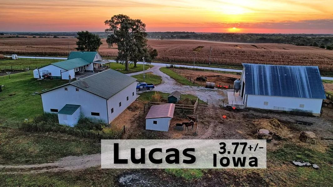 This 3.77 acres +/- Lucas County, Iowa acreage is a nice little hobby farm w/older Farmhouse, 2 car attached garage, 1 barn and 1 metal building, is all set up for livestock and is located in a quiet and serene country setting with crops and nature all around, but only 1.6 miles from the paved Derby Hwy. that goes from Hwy. 14 to Hwy. 65. The original farmhouse has 1,240 sq ft. of total living space, 1 BR/2 BA (two ¾ baths, one with shower and one with tub), plus an addition built in 2003 that has an additional approximately 340 square feet of living space and a spacious 2 car attached garage. There is an older 44x50 barn still in very good shape, and a newer 40x48 metal building with concrete floors and 10 ft. concrete porch & overhang, + big barrel wood stove for winter heat.