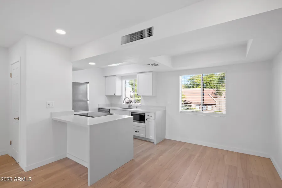 Modern, renovated 1BR/1BA with abundant natural light in a quiet top-floor corner location. Features include quartz countertops, new appliances, drop-in range, updated bathroom, walk-in closet with custom shelving, new flooring throughout, LED lighting, and a newer AC unit. Private patio and sleek kitchen design bring the outdoors in. Close to shopping, dining, and easy access to 101 & 51 freeways.