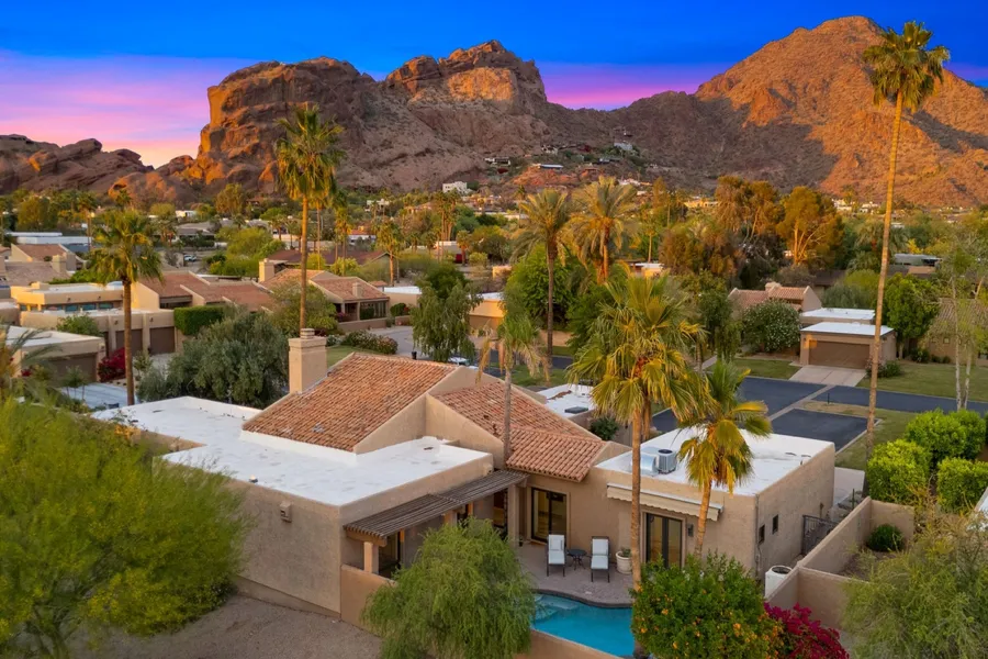 Discover effortless luxury in the heart of Arcadia at The Village at Camelback Mountain, a prestigious guard-gated enclave offering ultimate privacy and convenience. This exquisitely remodeled home showcases stunning views of Camelback Mountain through 8-foot windows that flood the interior with natural light. The professionally designed interiors feature a striking fireplace, a sleek chef's kitchen, and an indulgent primary suite complete with a large soaking tub and walk-in shower. Enjoy true indoor-outdoor living with a heated pool, custom waterfall feature, and serene outdoor patios surrounded by lush, green landscaping. This is your private oasis in the desert. Perfectly situated for an active lifestyle, this residence is just steps from the area's hottest restaurants, the
