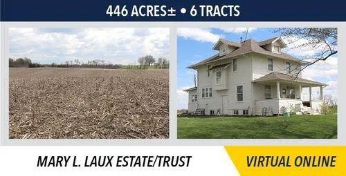 The Laux Farms will be sold in six (6) individual tracts, based on a survey that is currently in progress. Said surveyed acres will be used to constitute the final settlement price. Tracts 1, 2 & 3 will sell first on a price per acre basis and through the marketing method of "Buyer's Choice", whereas the high bidder can take any or all tracts for their high bid. "Buyer's Choice" auctioning will continue until all three tracts have been sold. We will then sell Tract 4 for a "lump sum", total dollar amount. We will then sell Tract 5 on a price per acre basis followed by Tract 6 for a "lump sum", total dollar amount.