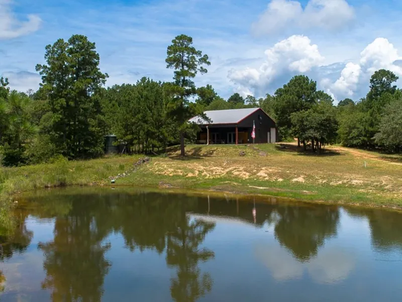Modern steel frame home + tiny home! ~ Nestled in 53+ acres of pine and oak forest, overlooking a scenic pond. Escape from the city, experience the peace & quiet of country life & star-gazing while still being minutes from Austin, ABIA & Lockhart. The home is a Barndominium w/ kitchen, Murphy bed in living area plus one bedroom with queen platform bunks. Bathroom with walk-in shower. All furnishings are available. Think 'West Elm' in the pines! Expansive 40' x 19' porch with great views. Ample workshop space in unfinished part of the barndo - 920 sf of floor space plus a large storage area upstairs. Tiny home is 276 sf and has 2 loft beds. It has been a full time Airbnb with good rental history. All have wifi connection. Primary water source is rainwater collection system. Aqua meter on property. Gated entry. Call your agent to make an appointment to view this special place!
