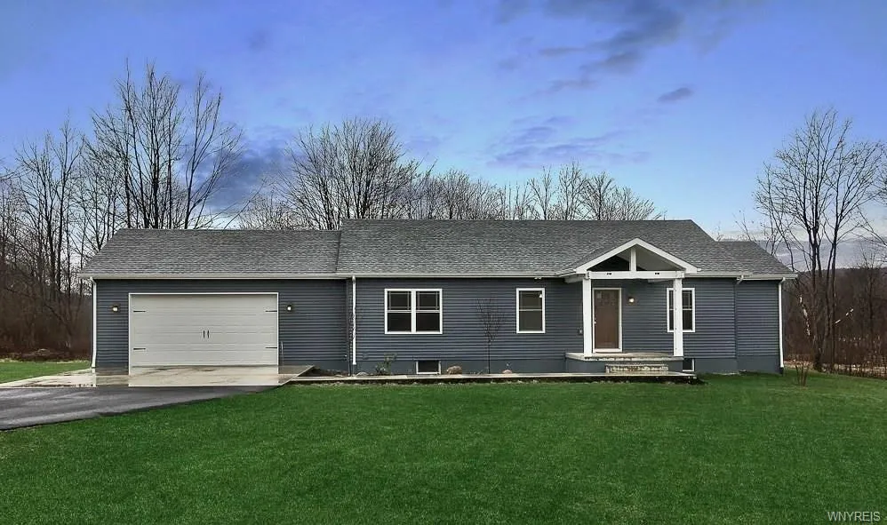 Ready-to-move in ranch on 6 acres located 10 minutes to Ellicottville or Salamanca. Desireable open floor plan: large kitchen w/ plenty of Kraftmaid cupboards & counter space for entertaining. Expansive living/dining area overlooks private backyard. Master bdrm w/ large walk in closet, swanstone shower. Two add'l bedrooms and full bath. Scissor trusses provide vaulted ceilings. Natural gas, poured foundation, full basement. 20kw generator w/ full auto transfer. 45K BTU nat gas heater in garage. 6"interior walls provide low energy bills. Private back deck. Great views.