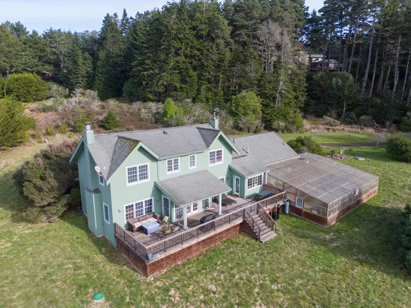 Captivating in every aspect, this recently remodeled Mendocino home nestled on 5 private acres has a wonderful blend of elegance, design and comfort. The top-tier Chef's kitchen renovation showcases a perfect fusion of modern amenities with timeless charm, featuring top of the line stainless appliances, stunning Caesarstone quartz counters, and a river rock wood-burning fireplace in the great room that adds a touch of warmth. With the open concept, solarium and greenhouse, this house is perfect for entertaining all year round. The cozy solarium has opening window access to the kitchen and flows right into the foyer for a wonderful useful space. You will absolutely love the huge attached greenhouse where you can enjoy growing a bumper crop of tomatoes, and bask in the warmth when you open the door to feel the heat streaming into the house. Greenhouse is an additional 1200 sf. Step inside to luxurious spaces, formal dining room den/office with additional river rock fireplace, refinished hardwood floors, and French doors that open straight out to west-facing views and vast deck. Lots of storage everywhere and a spacious butler's pantry that steps down to the greenhouse. Up the Berber carpeted steps are two separate ensuite bedrooms, both with generous closet space and privacy. Offering a distinctive blend of country living and modern luxury, this turnkey home presents a unique opportunity to own a wonderful home in a very desirable and sought after neighborhood. Minutes to Mendocino, restaurants and amenities, but in a setting with small farm possibilities, welcome home to Raven Lane!
