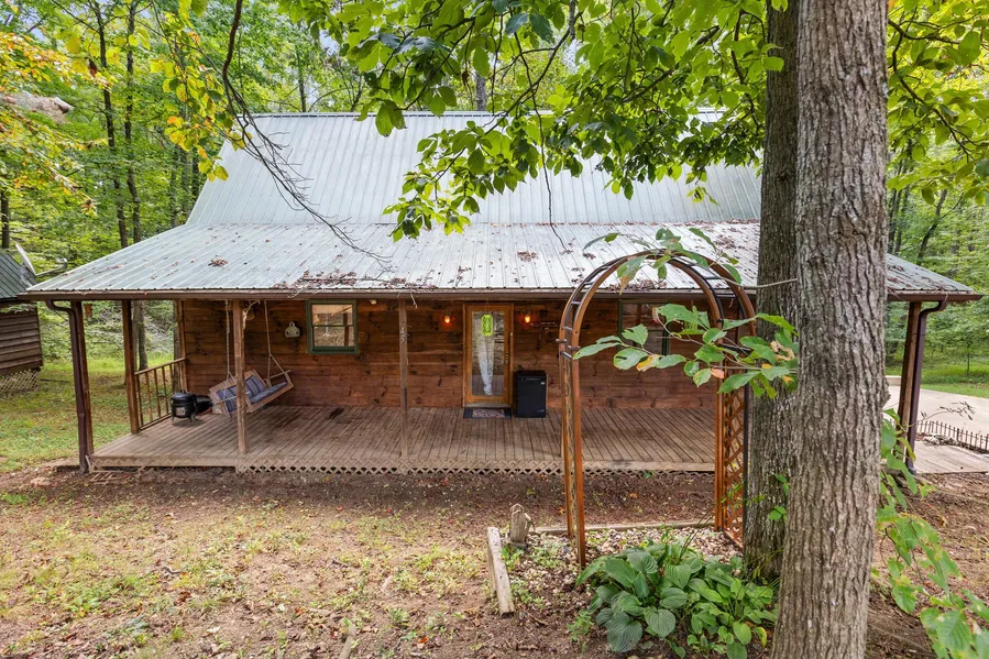 Tucked away in a serene wooded setting, this 3-bedroom, 1-bathroom cabin on a 1.23 acre lot offers the perfect blend of rustic charm and everyday comfort. Step onto the covered front porch and unwind on the porch swing, or head to the spacious rear deck where you can soak in peaceful views of the surrounding trees and wildlife. Inside, the home features a convenient first-floor primary bedroom that can also serve as a home office, providing flexibility to fit your needs. With warm wood finishes and nature just outside every window, you'll feel like you're on vacation every day while still enjoying the comforts of home. Whether you're looking for a quiet getaway or a year-round residence, this cabin delivers seclusion, tranquility, and natural beauty all in one.
