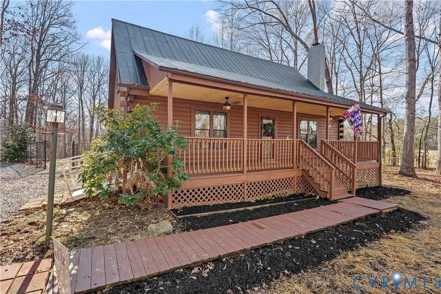 Welcome to 45 Morningside Rd., a true log cabin retreat nestled far back from the road on a wooded, PRIVATE 7.5+ ACRE LOT! A long, winding S-shaped driveway leads you to this turnkey home, surrounded by lots of usable cleared land, two detached barn/workshop structures, a lean-to shed, and a fully fenced backyard. Complete exterior and metal roof repaint/recoat completed in 2025. Enjoy a full country front porch with an exposed wood ceiling and dual lighted ceiling fans, perfect for relaxing any time of day. Inside, the main living room boasts true hardwood floors, vaulted ceilings with exposed beams, and a fireplace with a stone surround and custom wood mantle. The dining area features exposed beams, true wood floor, and flows seamlessly into the kitchen, which offers granite countertops, true wood cabinetry, stainless steel appliances, and durable LVP flooring. Just off the kitchen, a large covered deck with a lighted ceiling fan overlooks the private wooded backyard. The main level includes two bedrooms with LVP flooring, wood walls, lighted ceiling fans, and a walk-in closet. A full bath features river-rock flooring, a linen closet, new vanity, and a tub/shower combo. Additional conveniences include multiple closets for storage, a generous laundry space, and a 200-amp electrical panel. Upstairs, a spacious loft overlooks the living room and features new LVP flooring, exposed beams, and a lighted ceiling fan. The primary suite offers vaulted ceilings, a large walk-in closet, and an ensuite bath with river-rock flooring, tiled tub/shower combo, and a new dual-sink quartz-top vanity. This is a rare opportunity to own a private log cabin with character, abundant storage, outdoor living space, and multiple outbuildings, ideal for country living with modern comforts.