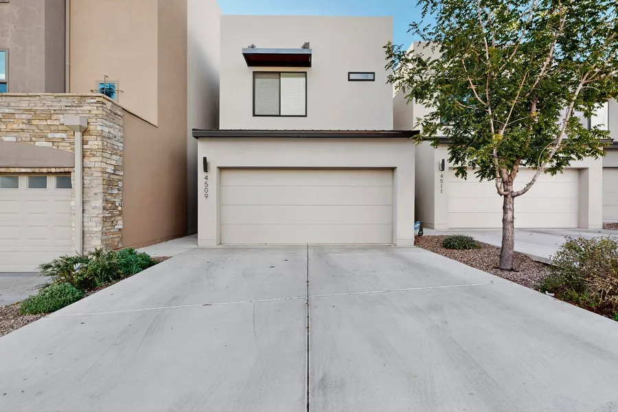 Bright and modern 3-bed, 2.5-bath townhome at 4509 Villa Loma Ln NE, Albuquerque, NM, offers comfortable living in the desirable NE Heights area. Vaulted ceilings, open floor plan, gourmet kitchen with granite counters and stainless appliances. Primary suite includes dual vanities and walk-in closet. Two additional bedrooms share a full bath upstairs. Enjoy a private patio, two-car garage, and low-maintenance yard. Energy efficient build, community near shopping, schools, trails, and dining.
