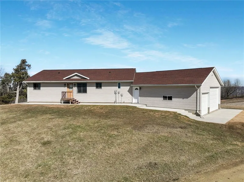 Excellent 4 bedrm, 3 bath home with 3-car attached on approx. 15 acres of which some is high quality tillable soil. The Hilltop Panoramic Views of the Chippewa River area include Holden Park & Dead Lake. Inside is an open concept with everything on the main floor. Great kitchen/dining/liv rm area with engineered hardwood floors & walkout to large deck overlooking the upper end of The Tiffany Wildlife Area. Main floor laundry shares a large 3/4 bath, there's 2 bedrooms & bath on one end of home with another bedroom/office/Rec rm area at the other end. Basement has another bedrm, large 3/4 bath and huge Family Room with a walkout. Extra long garage with a 10ft H x 16ft W O.H. door & handicap ramp to the 1st floor. Outside is a nice 26x35 pole shed. High Speed Fiber, several new windows 2024 & Updated within the past year: water heater, water softener, AC/Furnace. Dishwasher updated two years ago. Apron and sidewalk installed within last year. Excellent Location!