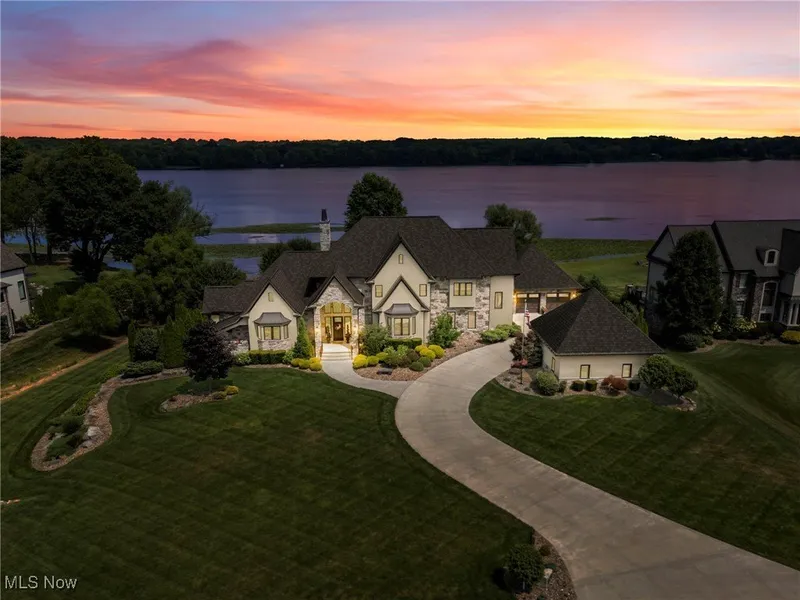 Welcome to this exceptional custom-built lakefront estate in the highly desirable Via Avellino development, located in the coveted South Range School District. Built in 2014 by Master Plan Builders, this architectural masterpiece offers over 4,811 square feet above grade plus an additional living quarters in the finished walkout lower level, combining timeless elegance with modern functionality. From the moment you arrive, the striking curb appeal, grand gables, stone accents, and manicured landscaping set the tone for what lies within. Step inside to discover a sophisticated interior featuring soaring ceilings, a dramatic 20' floor-to-ceiling stone fireplace and windows, wide-plank flooring, and an open-concept layout flooded with natural light. The gourmet kitchen is a showpiece, offering high-end cabinetry with integrated appliances, a massive waterfall island, double ovens, and panoramic views of the lake. The spacious dining area, and seamless access to the outdoor terrace make this home ideal for entertaining. The primary suite is a true retreat, with tray ceilings, a private sitting area, and a spa-like bath with a clawfoot tub, oversized walk-in shower, dual vanities, and a beverage station/coffee bar. Additional 3 bedrooms upstairs, each with their own bathrooms are equally impressive, with designer finishes and custom storage throughout. The lower level features a hidden man cave 26x30 accessible through a murphy door, with 10" sound-proof walls, and windows where you can still enjoy the gorgeous scenic views. Additionally, the walk out lower level offers a second living quarters with a full kitchen, dining and living areas rounded out by a bedroom and full bathroom. Private fenced yard, peaceful lakeside ambiance, and awe-inspiring sunsets from your own upper balcony, with every detail thoughtfully designed and executed, this lakefront masterpiece blends timeless architecture with modern comfort for a lifestyle that's second to none.