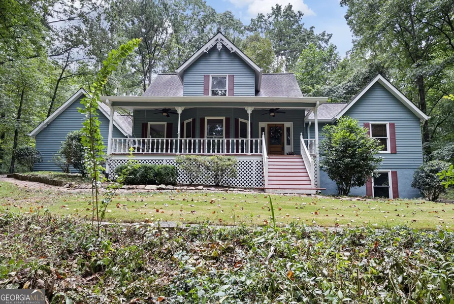 Welcome to your dream home-where privacy, character, and convenience come together. Tucked away on 4.5 serene, wooded acres, this custom-built gem offers a tranquil escape with unbeatable access to I-20, premier shopping, and dining just minutes away. Step onto the charming rocking chair front porch, complete with a porch swing and a stunning custom leaded glass front door-a perfect welcome for guests or peaceful mornings with coffee. Inside, you'll find a spacious, thoughtfully designed interior featuring fresh paint and brand-new carpet throughout and beautiful reclaimed hardwood floors full of warmth and charm. An open-concept layout that flows seamlessly between living, dining, and kitchen areas! Chef's kitchen with custom cabinetry, granite countertops, double ovens, a cooktop, and a built-in desk-ideal for remote work or meal planning. Dramatic great room with vaulted ceilings, perfect for entertaining or watching the game. The main level primary suite offers new carpet and paint, a luxurious soaking tub, separate shower, and a huge walk-in closet. Also on the main level: a stylish half bath with custom vanity and a spacious laundry room with a utility sink. Upstairs, enjoy two oversized secondary bedrooms, freshly painted and carpeted, with large closets and a full bath. Need more space? The massive unfinished basement with a boat door provides endless potential-whether you envision a home gym, workshop, storage area, or future living space. Welcome Home!