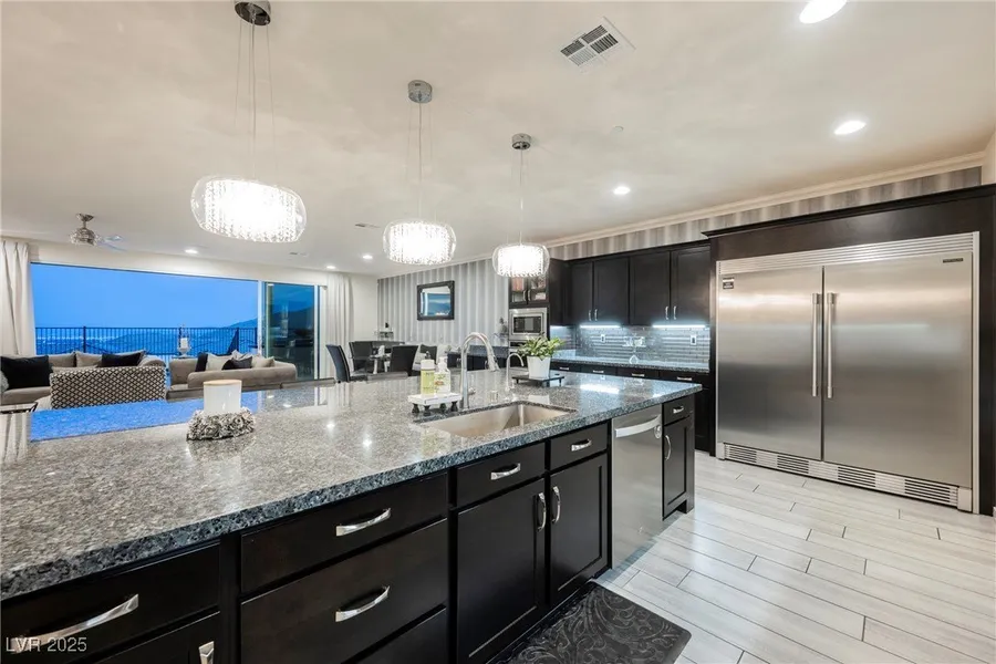 Experience elevated luxury in this 5,288 sqft (5,700+ with Loggia) Las Vegas estate designed for those who value elegance and modern sophistication. Featuring five refined bedrooms—including a serene first-floor guest en-suite—and five spa-inspired baths, this residence exudes timeless comfort. Indoor-outdoor living flows effortlessly with panoramic Strip views, a sparkling pool, soothing spa, fully equipped outdoor kitchen, and a private Loggia off the primary suite—perfect for relaxing or entertaining. Inside, enjoy designer finishes like intricate crown molding, four fireplaces, a culinary-grade chef’s kitchen, a temperature-controlled wine gallery, and elegant California Closets. State-of-the-art amenities include full home automation, theatre-quality surround sound, integrated audio, and a premium security camera system. An oversized 3-car garage and over $500,000 in upgrades complete this extraordinary retreat on the coveted “Amazing View” street.