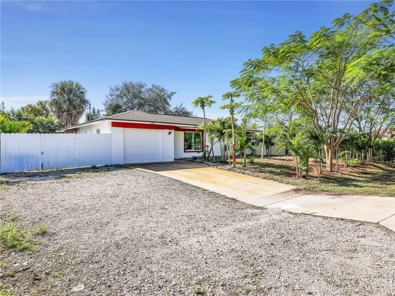 OVER SIZE CORNER LOT - FULLY FENCED Excellent location close to schools, shopping, and restaurants. This well-kept home sits on an oversized corner lot with a fully fenced yard, fruit trees, and a large storage shed. Multiple fence access points allow convenient parking for a boat, trailer, or other toys (verify with Collier County). Surrounded by well-kept homes on the south side of the Parkway. Features include NEW roof, NEW HVAC, impact windows and doors, new garage door and opener (1/19/2023), new well equipment, new exterior door paint, new white electrical switches/outlets, and plank tile flooring throughout. Fresh paint on the garage floor enhances the clean look. The garage has been converted into an additional room, providing extra living space, but it can easily be converted back to a garage if desired. Bright interior with plenty of natural light. The primary bedroom offers a walk-in closet, and the kitchen includes a pantry for added storage. Rear of home offers desirable southern exposure. Move-in ready and easy to show!
