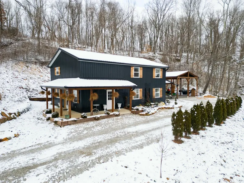 This stunning 2-bedroom, 1.5-bathbarndominium offers modern comfort with no detail overlooked. The home features high ceilings and large windows, filling the space with natural light. The first floor includes heated floors, a convenient half bath, and a kitchen with elegant marble countertops. Upstairs, you'll find beautiful hickory wood flooring and a laundry area. Step outside to enjoy the fully equipped outdoor kitchen with a fridge and electric smoker, perfect for entertaining. Relax on the front porch with lovely sunset views. The 6.45-acre property includes private hiking trails and stunning scenery, providing a peaceful retreat. Also this is close to Hocking Hill Region for you to enjoy more of nature. This is 30 miles from Columbus and 20 Miles from Hocking Hills